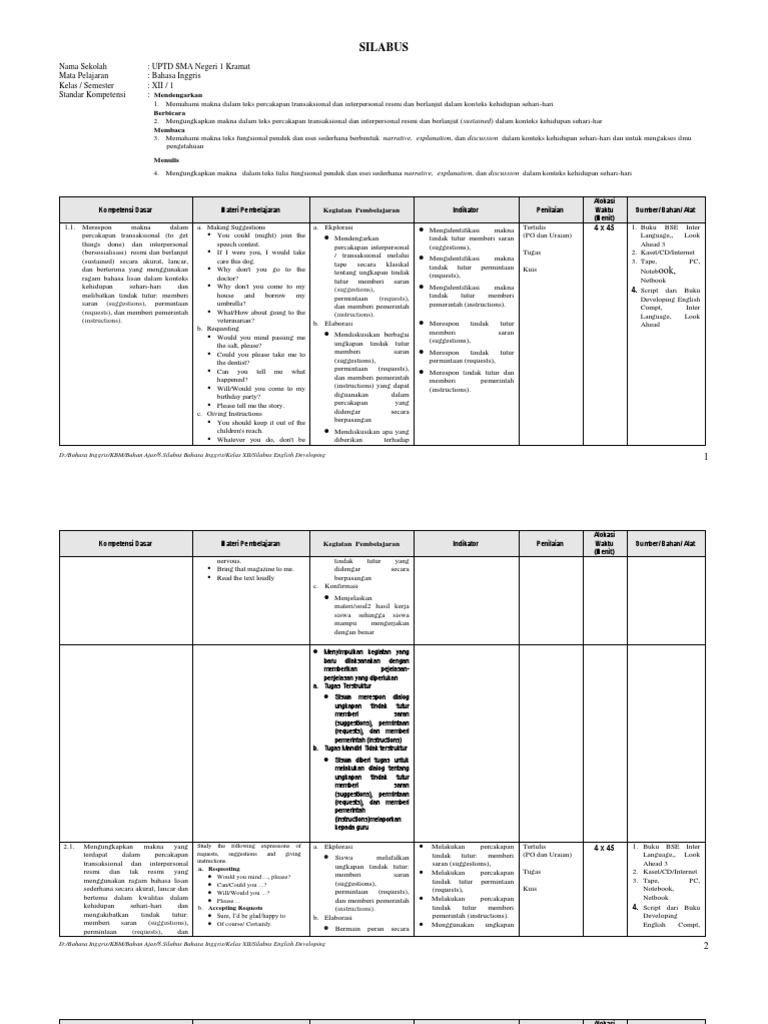 Silabus revisi 2020 bahasa inggris minat kelas x. Soal bahasa inggris peminatan kelas 10 semester 1 kurikulum 2013. Download contoh silabus dan rpp sma kurikulum 2013 versi kemdikbud revisi 2018. Setelah hasil revisi kurikulum k13 selesai tentunya pasti ada perubahan yang terjadi dan perubahan tersebut akan kami bagikan contoh penyusunan silabus dan rpp sma. Silabus mencakup standar kompetensi, kompetensi dasar, materi pembelajaran, indikator, penilaian, alokasi waktu.