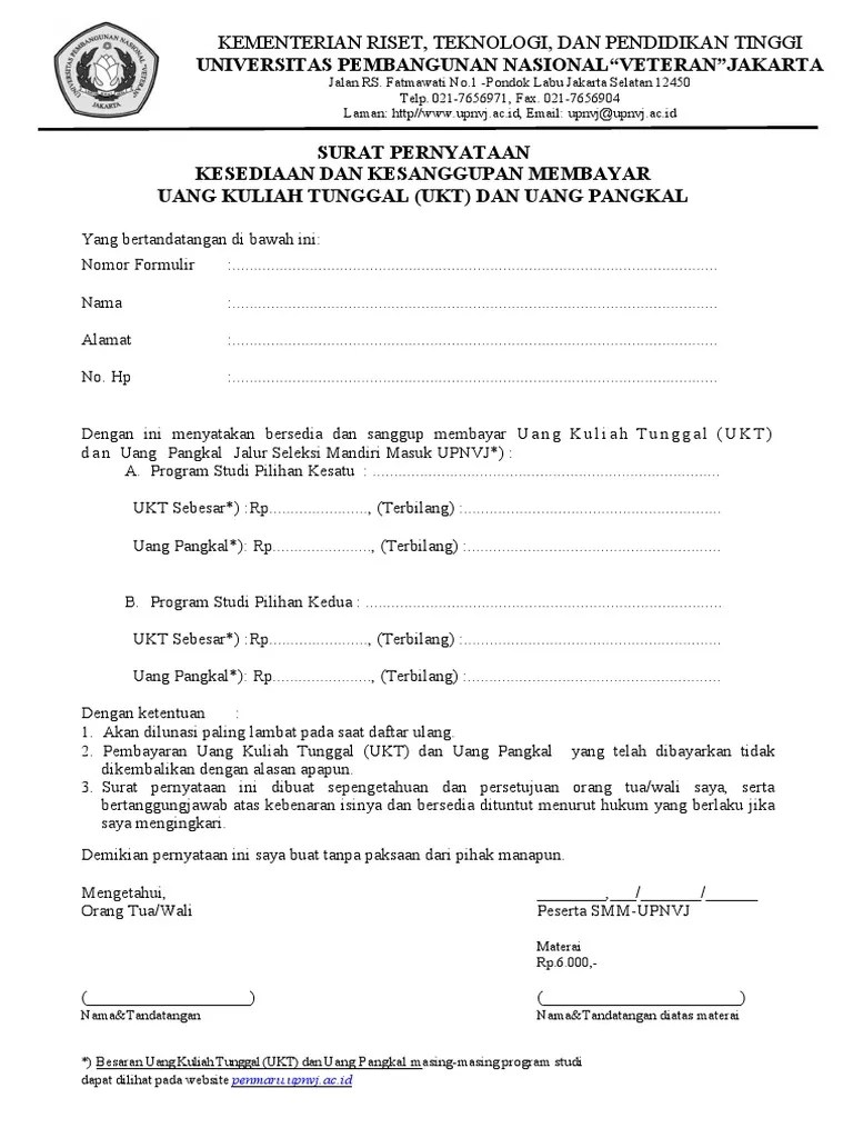 Uang kuliah tunggal dan sumbangan pengembangan institusi. Contoh kebutuhan akan surat ini meliputi menjalani ikatan dinas, membayar utang, menaati peraturan, dan lain sebagainya. Membayar uang kuliah tunggal (ukt). Sanggup membayar seluruh biaya pendidikan sesuai ketentuan yang berlaku bila diterima di. Sumbangan pembinaan pendidikan yang telah .